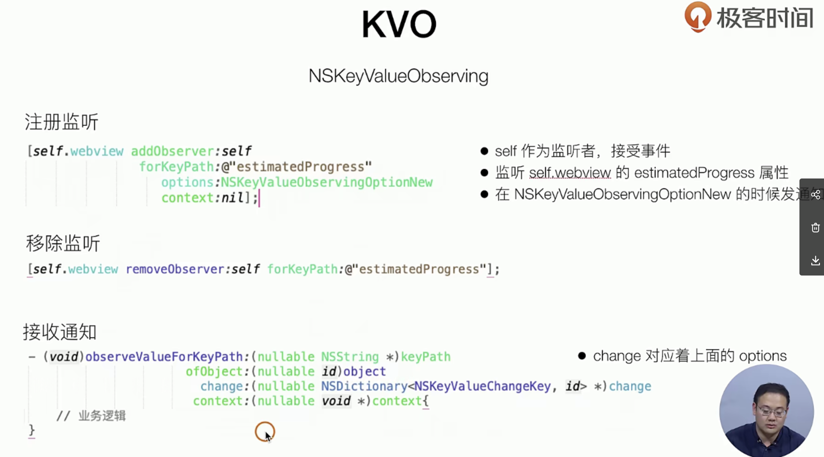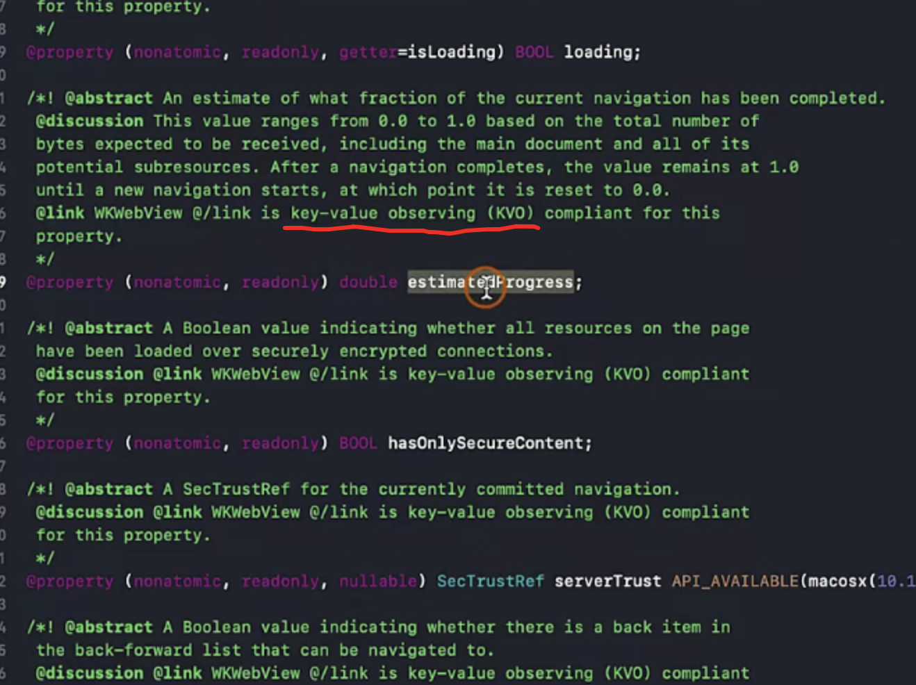 // 搞上一个KVO观察者模式 1. 注册 监听某些属性的变化,比如这里监听的是estimatedProgress变化时,该属性如何变化时触发方法呢(estimatedProgress属性新变化的时候触发)? 需要传递什么参数呢,