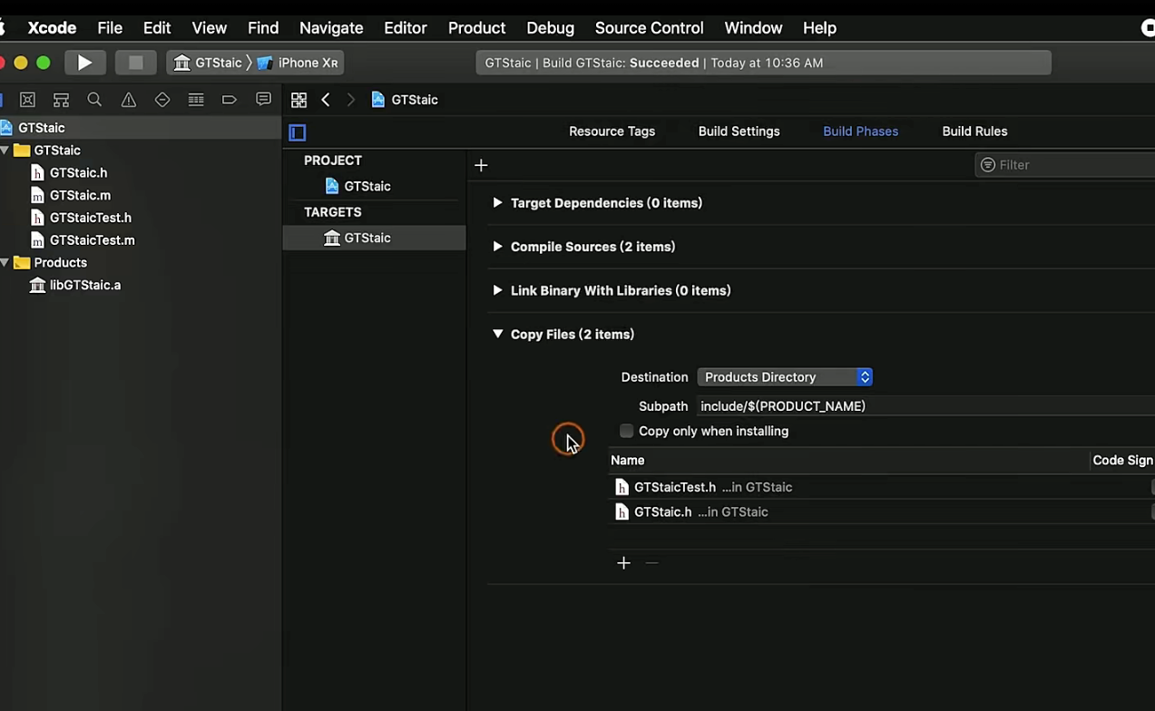 安装上述步骤 ,build 下,静态.a 文件就出来,这个就是要用到的二进制文件。然后点击CopyLikn 把需要为h 头文件 暴露出去