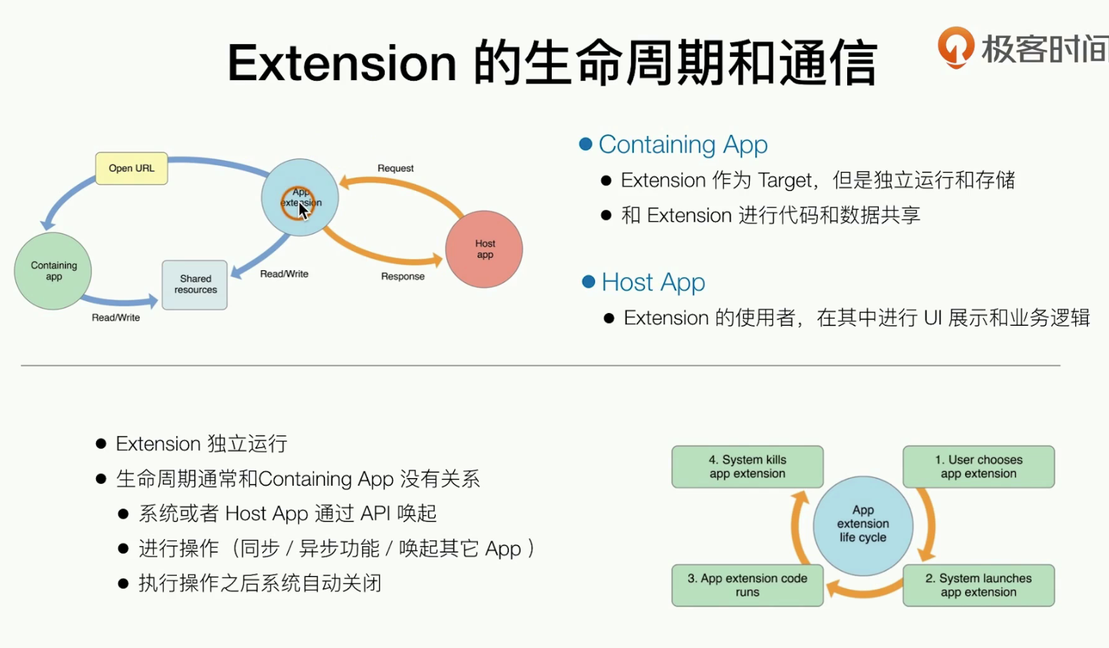 宿主App HostApp 调用Extesion ,由Extendsion 启动被唤醒,进行一些ContaiingApp的逻辑或者功能,功能用完之后好,系统会把它自动kill掉