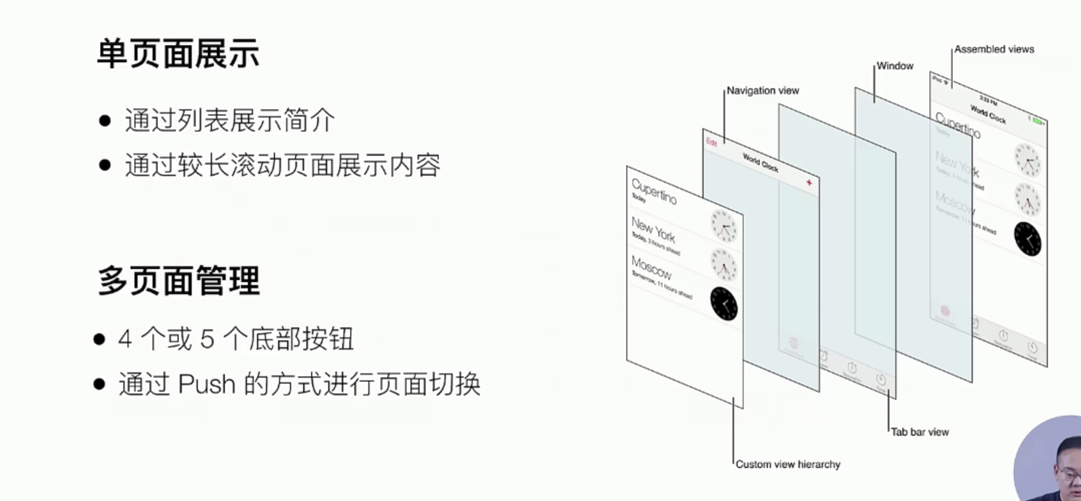 | App展示界面 + 动画 | 底部TabBar Navigation 列表 ImageVIew Button/Label TextView WebView 动画 |