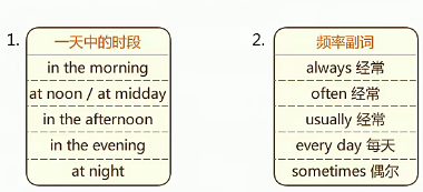 | day 白天 morning 早上 noon /miday 中午 afternoon 下午 evening 傍晚 (18-20点) night 夜晚 (20-23点) mid-night 半夜 |