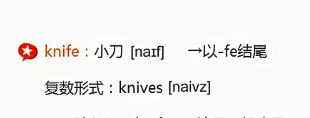 | wife -> wives 妻子 housewift -> housewives 家庭主妇 knife -> knives 小刀 |
