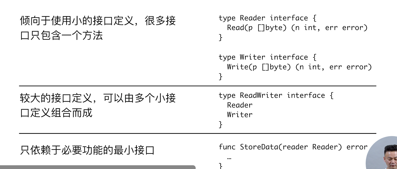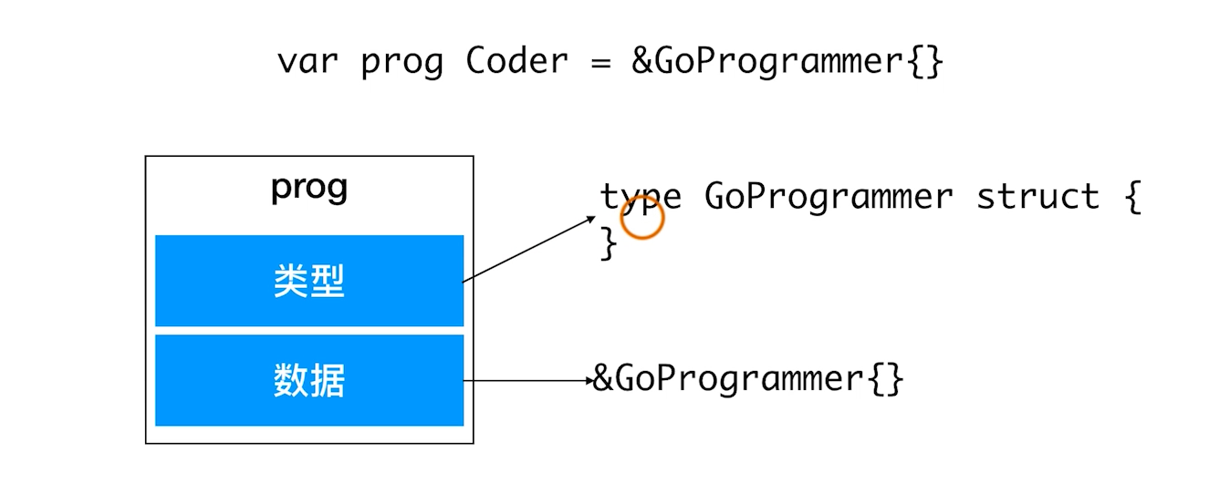 go中如何定义interface,我们不想要implmenet 去实现,这种就是dockType ,它的意思是看起来一样 (方法名完全一致) 它的借口的实现不需要依赖它的定义