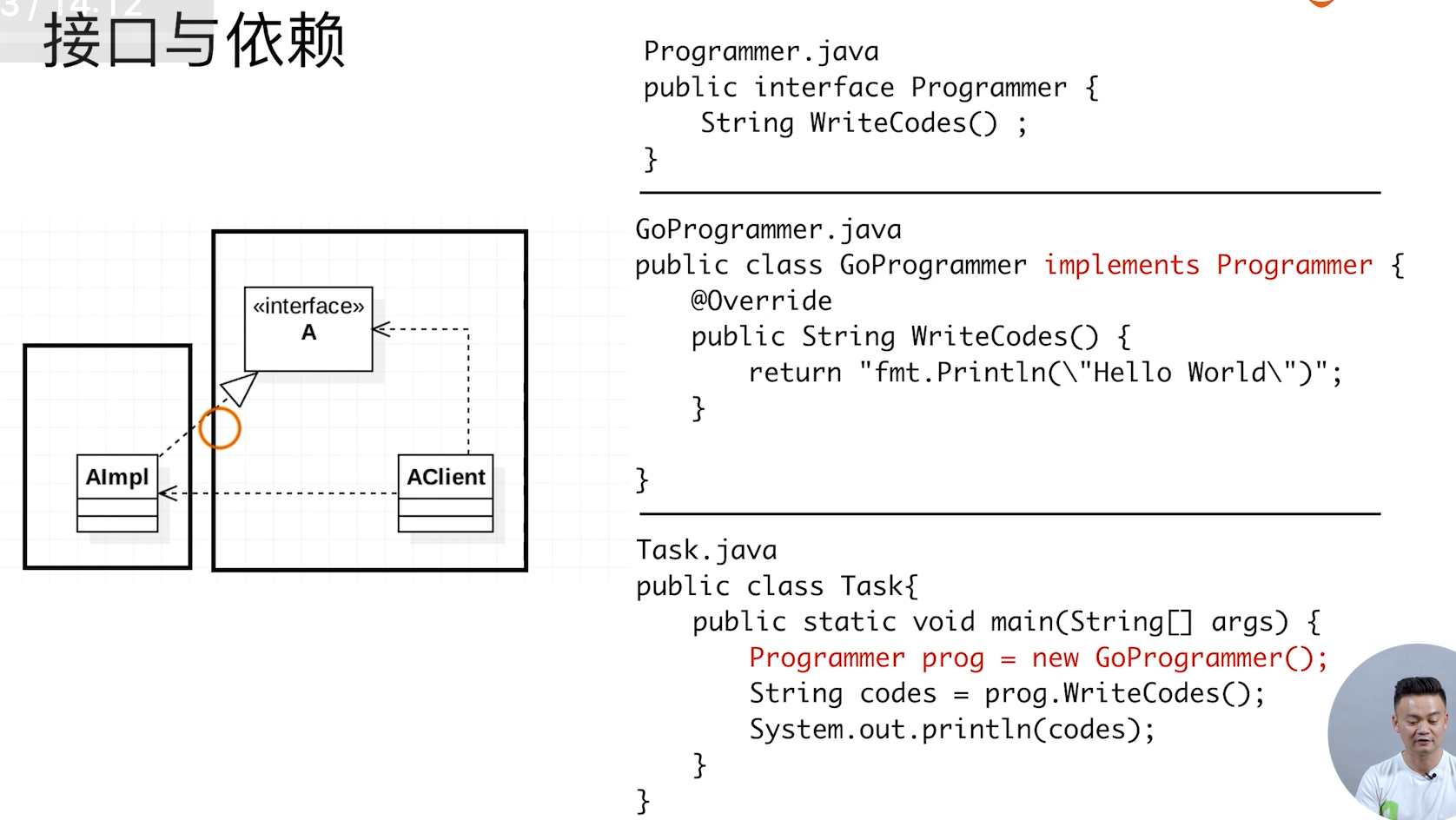 下面的代码展示了java中的循环依赖 ,java中会单独把interface 放在一个独立的pkg中就解决了这个问题