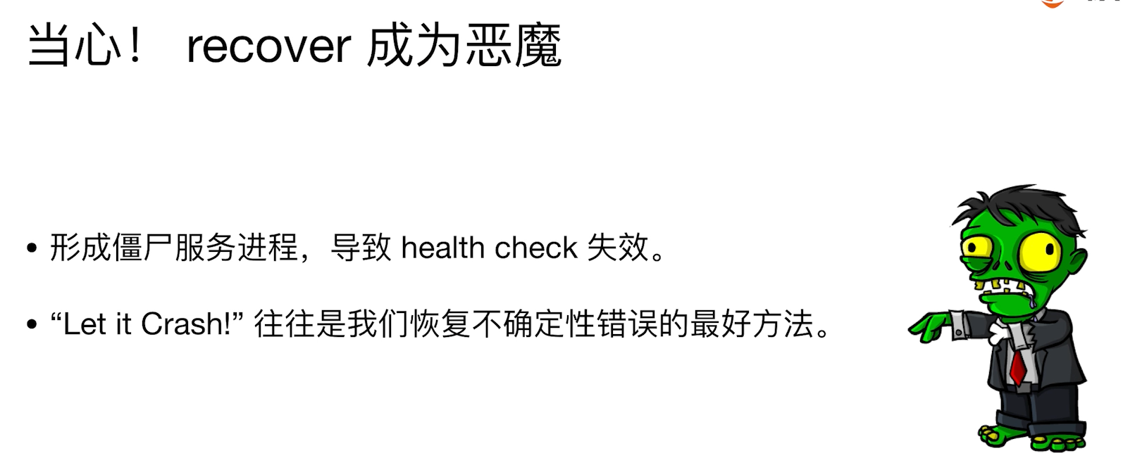 注意revocer 不要滥用 ,会导致僵尸进程(你的程序是错的了,但是它依然在运行)更加合理的做法是让程序重启来解决一些未知的错误。
