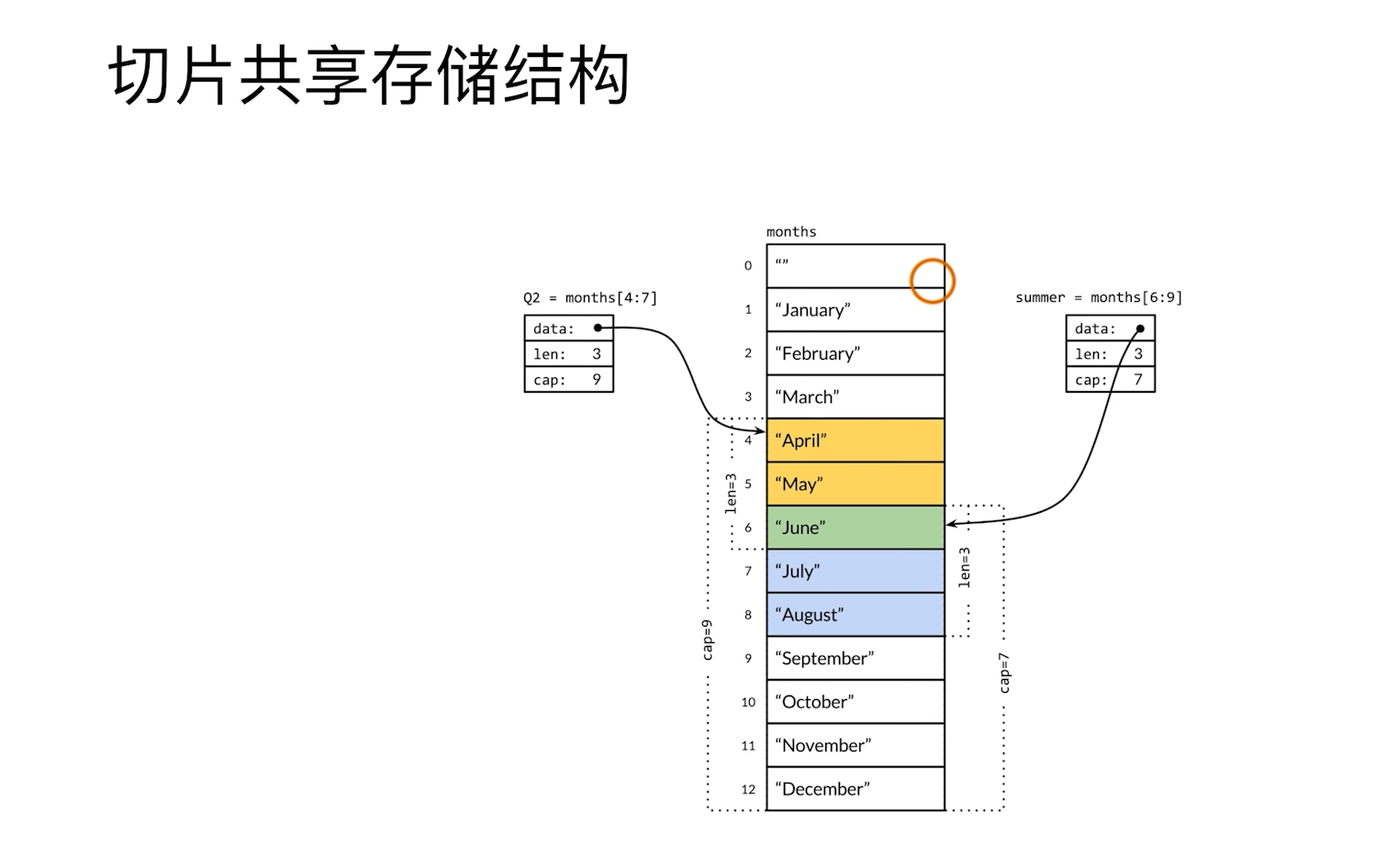 这里需要说明的months 这个 array 再内存中是存在的 sliceQ2 和 sumer 如果指向 了这个Array 那么他们的修改 会直接彼此互相影响,因为 指针指向的引用没变