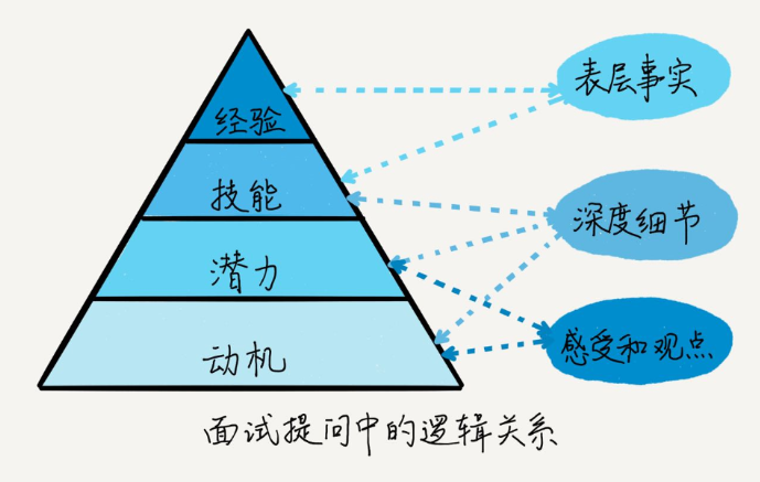 面试官绝大多数在面试的过程中主要考察面试者的问题是下面四个:经验、技能、潜力、动机。他们的目的就是找到与岗位匹配的候选者,而岗位的要求就体现在 前面的四个点上。