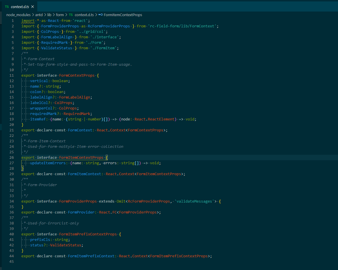 从上面的例子来看,我们是否每一个组件都有必要在文件的内部加入types 外部如果需要应用又该怎么办?一个相对流行的社区解决方案是写到.d.ts文件夹中,需要源码也是如此,比如antd的源码