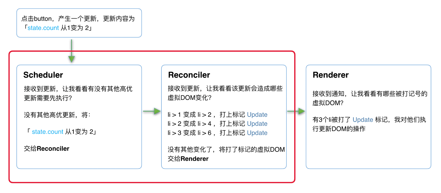 React的旧版本架构:两层设计 协调器(什么组件需要渲染 ) Reconciler(找变化) / 渲染器 Render(执行渲染)