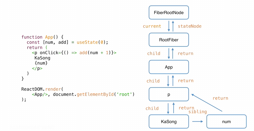 纤程与进程(Process)线程(Thread)协程(Coroutine js中已经有实现了generate)同为程序的执行过程,Fiber的含义有三,作为架构,作为数据结构 ,作为动态的工作单元。用return指代父级节点。